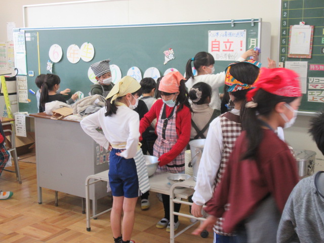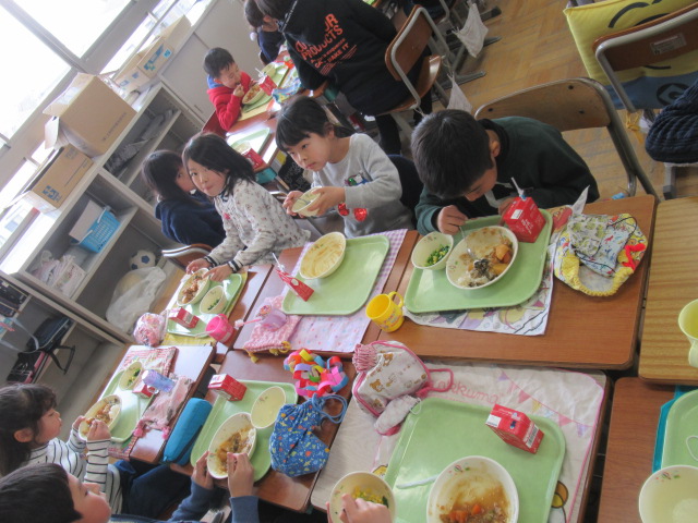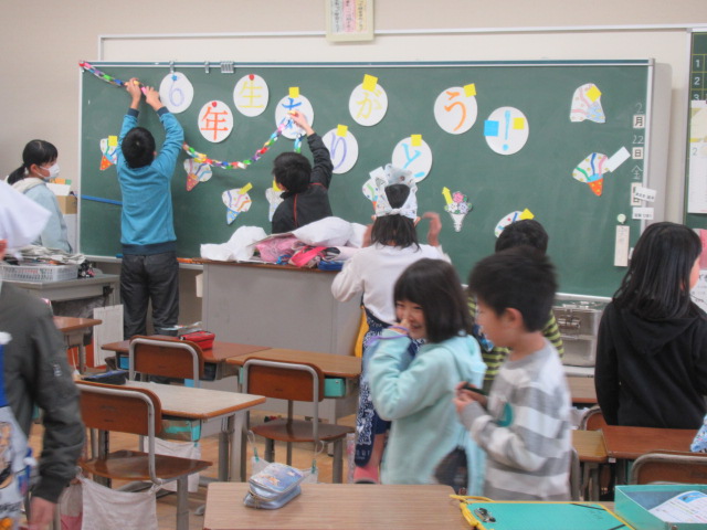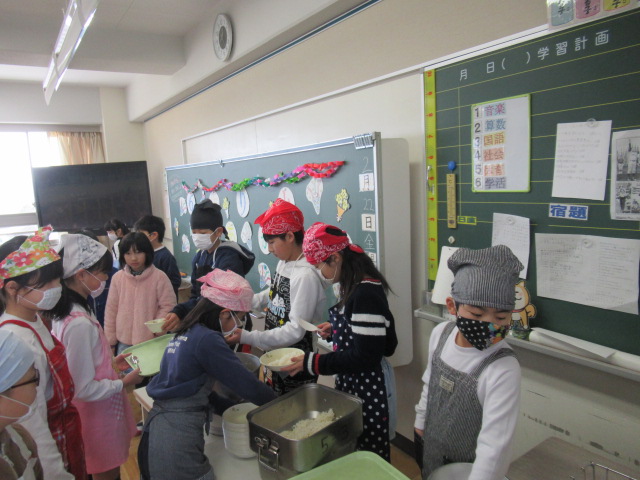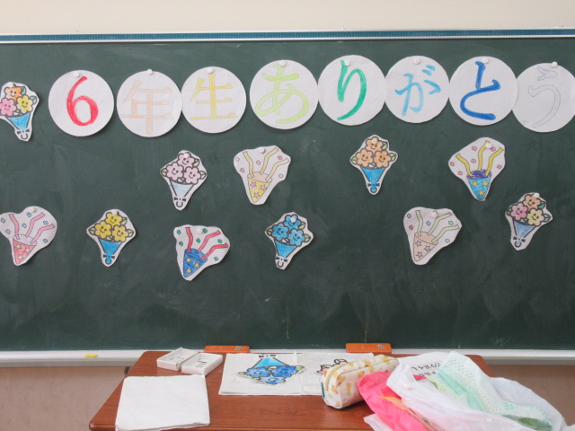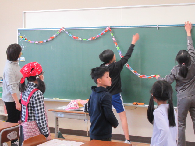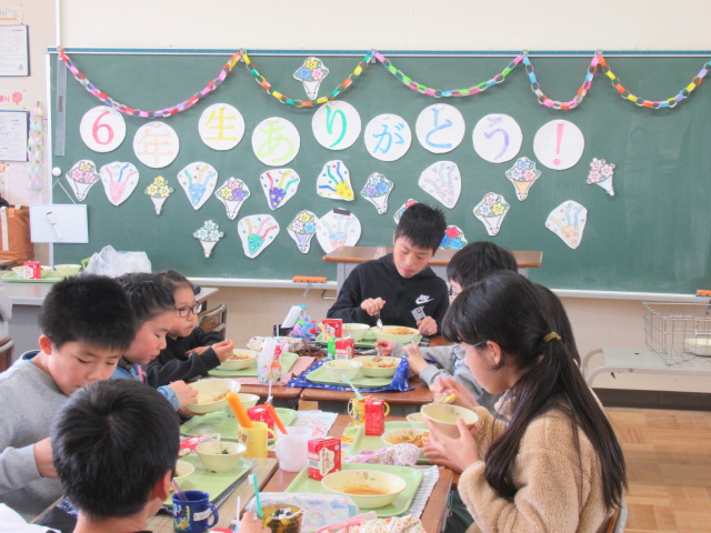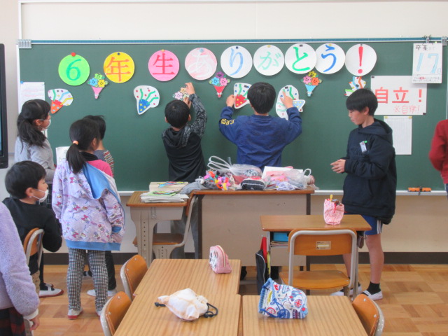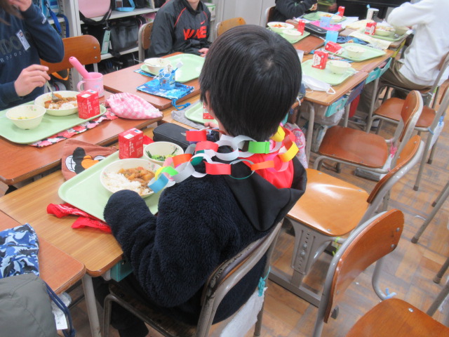 先週1~5年生で作った6年生へのプレゼントの色紙、ネックレス、教室装飾用の「輪飾り」を準備して給食の配膳を行いました。