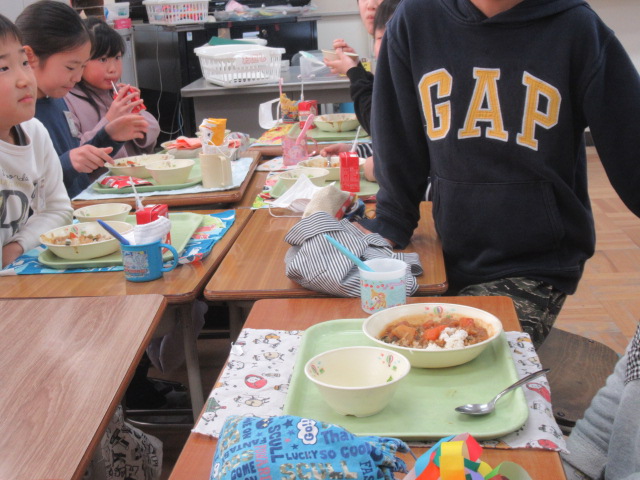 プレゼント渡しのあとは楽しく会食、今日の献立は大人気のカレーライスとサラダでした。