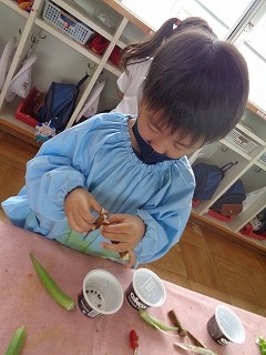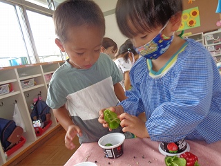 今日は、食べられなくなった野菜を使っていろいろな遊びをしました。