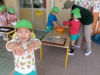 冷たい水で洗っていても、これから食べるほかほかのやきいものことを考えると、ニコニコ笑顔になるみんなです♪