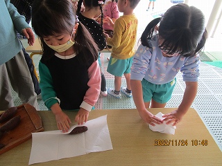 肌寒い中、ごしごしと芋を洗うきりん組さん!