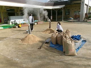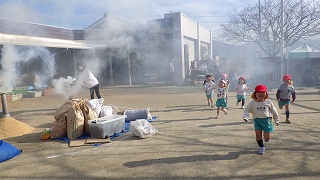園庭では、燻炭器から煙がもくもく~!