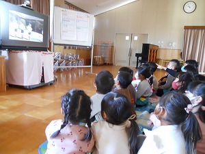 今日は、幼稚園大会のDVDを5歳児きりん組さんが見ました。