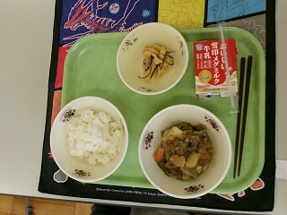 自分たちでお盆をとって、牛乳、ごはん…と順番に乗せていきます。