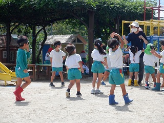 おばけ鬼ごっこを楽しんでいます。先生のところに集まっている4歳児りす組さん、何かが始まりそうです!