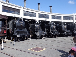 扇形車庫から蒸気機関車(SL)が頭を出して出迎える姿は圧巻です。