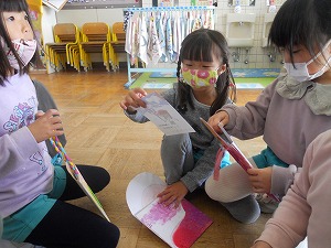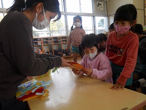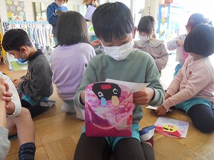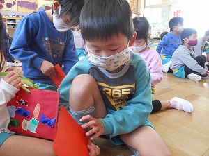 自分達が作ったおみやげ袋に入れて他園に届けました。