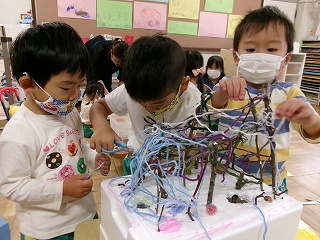 毛糸や木の枝を使って製作遊びをしています。