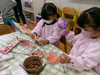 カラフルな色の紙粘土やどんぐり、木の枝を使って、ごちそう作りも始まっています。