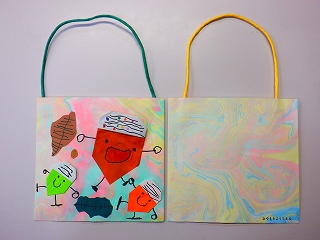 マーブリングを楽しんだ紙で作ったおみやげ袋、かわいいドングリさんも自分たちで作りました。