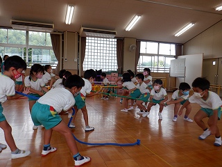 子どもたちが楽しんでいるのは、真ん中に置いてある5色のロープを引っ張って、