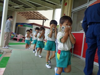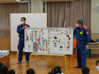 お部屋で担任の先生から、火事になったときは煙がいっぱい出ること、煙は上にあがるので、低い姿勢で行動することなどを聞き、ちょっぴりドキドキしながら出発です。