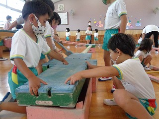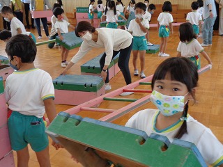 「こっち持って」「一緒に運ぼう」と重たいものも友達と力を合わせて運んでいきます。