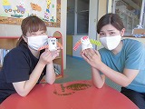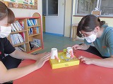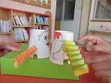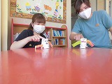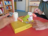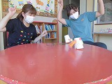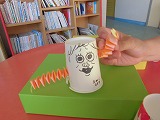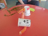 今日は、元気な子どもたちに会えて、 一緒に元気いっぱい遊べて、 とってもうれしかったです。 「朝から、早く行こ~と急かされて」 とうれしい言葉も聞かれました。 明日のお友だちとも、 元気いっぱい遊べるのを楽しみに お待ちしていますね。 さて、きりん組さんお待たせしました! 動く紙コップ人形は作れたかな? その紙コップ人形を2つ使った 応用編を紹介します! まずは、『どっちが前に進むかな? よーい、どん!』で競争です!!! よーーーーーい、どん!!!  あれあれ、前に進むかと思いきや、カーブ!?  どっちに進むかな?と わくわくしながら競争できるのも 楽しみの1つです!  前を向いて進んでるかと思いきや、 すってんころりん、こけることもあります・・・ ペットボトルのふたをどっちに巻くと、 どっちに進むのかな? と、考えてみるのもおもしろいよ。 今度は『トントン相撲』で競争です! 紙コップ人形2つと、空き箱を用意してね。 紙コップの中に入れている、 ペットボトルのふたと輪ゴムは 外したほうが、前に進みやすいよ。 では、今日の戦いの選手を紹介します。