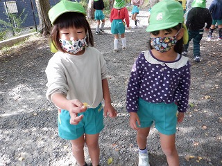 葉っぱや、枝、どんぐりなどの自然物を見つけては、うれしそうな子どもたちです。