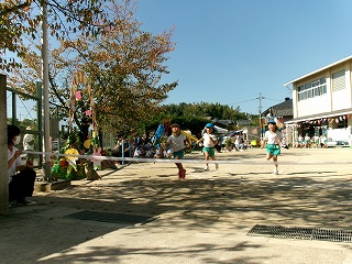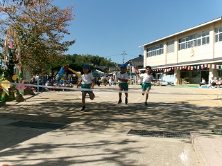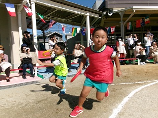友達とタイミングを合わせながら、きりん組オリジナル旗もあがりました。まずはかけっこ!