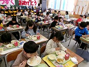 1年生の給食風景を紹介します。「とてもおいしい」とほっぺにおべんとう(ごはんつぶ)をつけて食べている児童もいました。なんとかわいい!