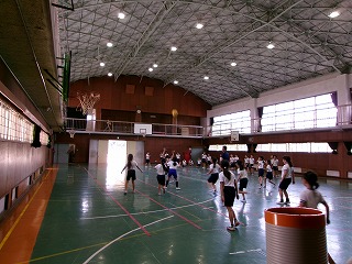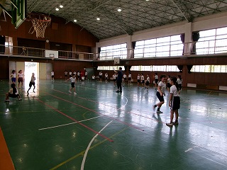 ソフトバレーボールを使い、キックベース風のゲームを学級全体で行っていました。