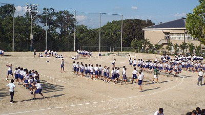今週初めから、体育大会の取組はスタートしていますが、本日から一斉のブロック練習がスタートしました。今年の体育大会は、実行委員会が全校生徒にアンケートをとり決定した「Never give up~秘める闘志に火をともせ~」をスローガンに、7色のブロックで取組を進めています。本日の練習の最後は、大縄跳びでした。