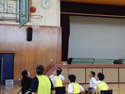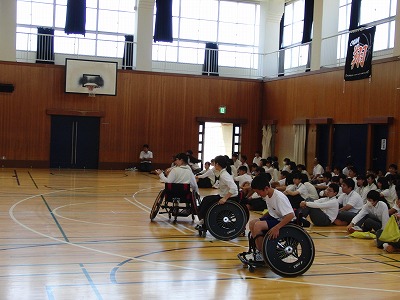 講義の後、リレー形式で車椅子体験、バスケットボールの試合を行いました。