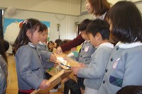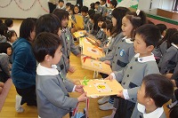 年中児が、「おにいちゃん・おねいちゃんは何の動物が好きかな?」と年長さんの事を思いながら一生懸命動物の顔を作り、ファイルにつけ、「ありがとう!」の言葉とともに年長さんにプレゼントしました。プレゼントをもらった年長さんは照れながらもうれしそうな表情でした。