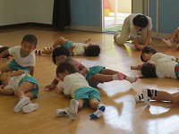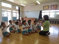 「おはようございます!」「先生のこと、おぼえているかな?」「はーい!岡田先生!!」「いっぷくたっぷくたびらかもっぱい・・・・・」わらべうたを歌いながら指先を動かしたり、