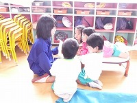職場体験で大住中学校から15人のお姉さん達が来てくれました。大喜びの子ども達は「あのね・・・」「これはね・・・」といろいろ話しかけたり、「一緒に遊ぼう!」と誘って好きな遊びをしたり、いきなりだっこやおんぶで甘えてみたり・・・と一日、楽しく過ごしました。