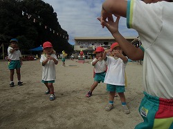 音楽に合わせて、踊っている小さい組さん。大きい組さんの踊っている姿をみながら、真似をし、ヒーローに変身中です。
