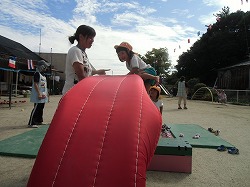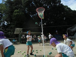 高いかごをめがけて「えいっ」と玉入れをしている、大きい組さん。玉がどんどん入っていきます。