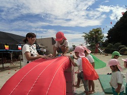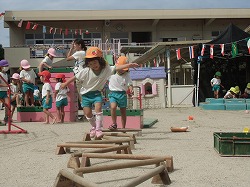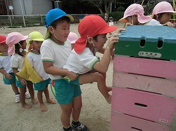 小さい組さんにとっては、高過ぎる壁のため、なかなか登れない子もいます。すると、大きい組さんがお手伝い!!頼りになるお兄さんです。