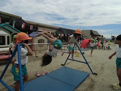 鉄棒にも挑戦中!友達がしていると、「私もしたい」と子ども達が集まってきます。