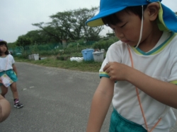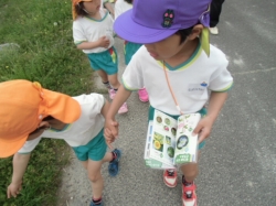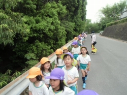 年長児と年中児で手をつないで、園の周辺に散歩に行きました。