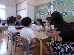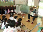 そして、最後は、ALTの先生達に英語の手遊びを教えてもらったり、絵本を読んでもらったりしました。また、色鬼の英語バージョンも楽しみました。ALTの先生が「グリーン」と言うと、「グリーン、グリーン」と言いながら、部屋にあるグリーン(緑)の物を探してタッチしにいく子ども達。今日は、遊びの中で楽しみながら、たくさんの英語に親しみました。
