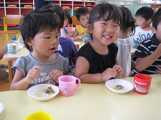 水遊びをした後に、みんなで育てたゴーヤを入れて”おやき”を用務員さんにつくっていただき食べました。ちょっぴり苦かったけれど、「おいしーい」と満足そうな顔をして食べていました。