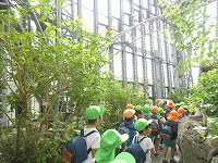 放蝶温室に行き、いろんな色のたくさんの蝶を見ました。子ども達の帽子や保育者の手に蝶がとまる程とても近くで蝶がとんでいました!!