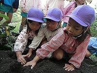 大きい組さんが小さい組さん(3歳児)にみんなで洗ったお芋を、アルミホイルで包む方法 を教えてくれました。