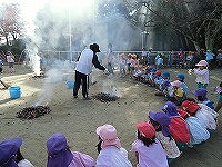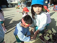 全園児、そして保護者の方で拾って集めた落ち葉、枝を使っての焚火で焼き芋ができる様子を見たり、焼き あがるのを待っている間も一緒に遊んでくれていた優しい大きい組さんでした。