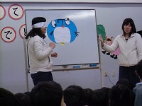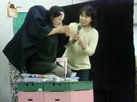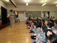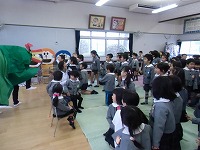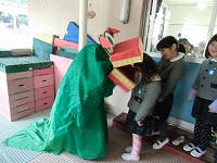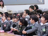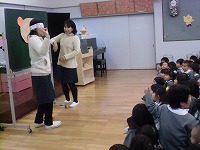 今日は子ども新年会!子ども達はどんなことが待ってるんだろうと、ワクワクしながらホールに集まりました。ホールではお正月遊びを先生達で披露しました。 二人羽織では教頭先生がお化粧をして大変身!!子ども達はみるみる変わる教頭先生の顔を見て大喜びでした。 福笑いでは「みぎ!もっとうえ!!」と声を張り上げ、先生に貼る場所を教えたり、「変な顔になった!!」と笑顔いっぱいでした。