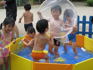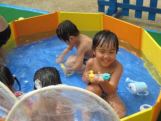 「ほら お水かからないよー」とビニールつきの輪を持って、水鉄砲を持っているお友達に声をかけたり、シャワーの下をくぐったり、顔に水がかかるのが嫌いな子ども達も元気いっぱいに水遊びを楽しんでいました。