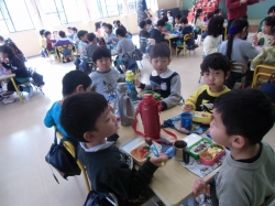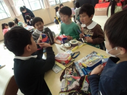 お弁当もホールでみんなで食べました。もうこの頃には「あ、〇〇ちゃんも卵焼き入ってる!一緒やー」「次、外で一緒に鬼ごっこしよう!」と初めて会ったお友達と楽しそうに話す姿も見られるようになっていました。