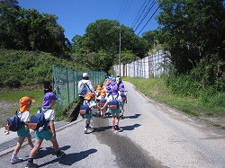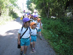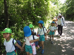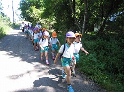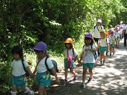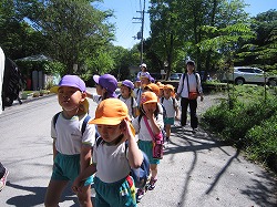 4歳児と5歳児で手をつないで、目的地の野外活動センターを目指して歩きました。