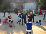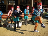 年長児・年中児も、園庭で鬼のお面をかぶり、元気いっぱい豆を投げたり、逃げたりしながら