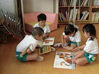 借りた絵本をほかの子ども達と一緒にみて「みてみて」「いっしょにみよ」など