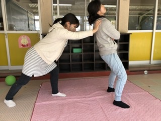 ⑤その次は、負けた人が勝った人の背中を押します。動くかな。