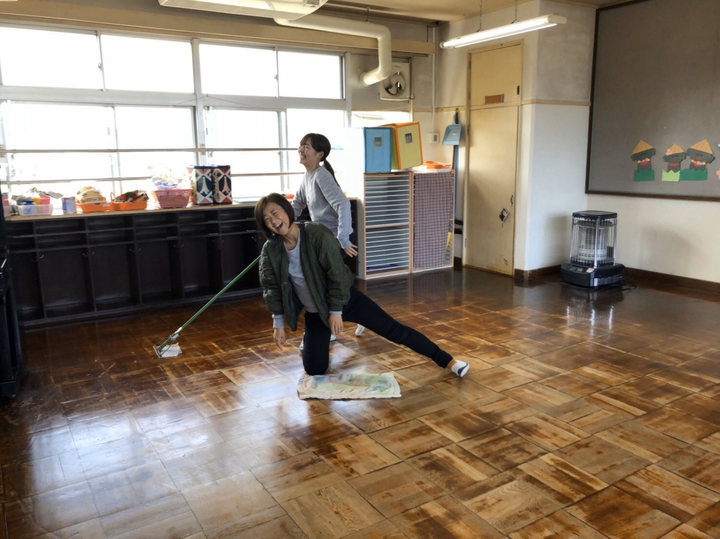 今日は保育室のワックスがけしました。楽しい話をしながら頑張っているよ。