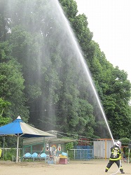 次は、外へ出て、消防車を見せてもらったり、放水の様子を見せてもらったりしました。