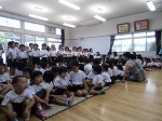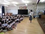 ホールには、子ども達が作った七夕飾りがついた笹を飾り、園長先生から、七夕の話を聞きました。また、5歳児のお友達に、どんな願い事をしたか、園長先生からのインタビューもありました。