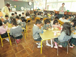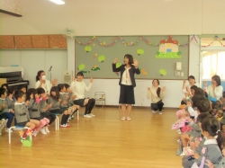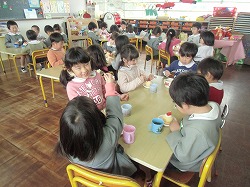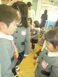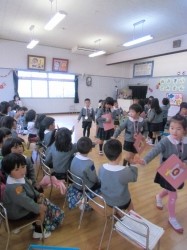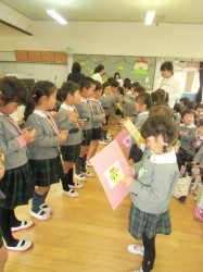 3日後には、大好きだったおおきい組さんの修了式が行われます。一足早く、"子供お別れ会が開かれました。幼稚園のみんなで親しんできたわらべうた遊び「いっぷく たっぷく たびらか もっぱい・・」で始まりました。