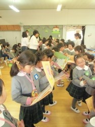 「なに 小学校?」「大住小学校!」「私は、桃園小学校!」