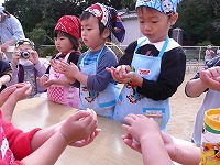 炊けた餅米を口に入れて、何回もかんでいるうちに口の中でお餅が出来ることにビックリした子ども達!つきたてのお餅を、きなこもちや醤油もちで食べたり、自分たちでお餅をついたり、「お餅温かい」「ふわふわや」等友達と言いながら丸めたり、とっても楽しそうな子ども達。